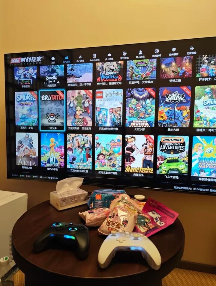 在南京新街口的小熊電玩店,假期里所有包間都幾乎排滿(mǎn)。這家店不僅有PS5、Switch等主機(jī)游戲,還有邊牧、緬因貓、小浣熊、鸚鵡等“動(dòng)物店員”,顧客可以邊擼寵邊打游戲,還可以體驗(yàn)拼豆、觀影等項(xiàng)目。這種“精神按摩”式的消費(fèi)場(chǎng)景,正成為都市年輕人的新寵。
