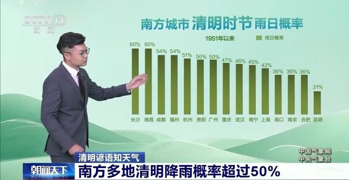 大城市當(dāng)中,像是長(zhǎng)沙、南昌、成都、福州,在清明時(shí)節(jié)遇雨的概率都超過(guò)了50%,大家在南方還是要帶一把傘。