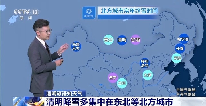 清明節(jié)氣是二十四節(jié)氣當(dāng)中諺語(yǔ)最多產(chǎn)的節(jié)氣。在北方,我們常說(shuō)“清明斷雪,谷雨斷霜”。清明斷的是什么樣的雪呢?對(duì)于我國(guó)中原地區(qū)來(lái)講,大多數(shù)的終雪時(shí)間都在春分節(jié)氣。在清明時(shí)節(jié)降雪的城市主要集中在烏魯木齊、呼和浩特、長(zhǎng)春、哈爾濱等城市。