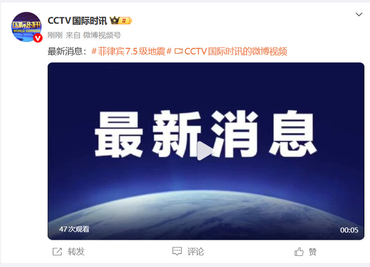 菲律賓發(fā)生7.5級(jí)地震 來(lái)源:  編輯: ? 2025年11月28日 據(jù)菲律賓火山地震研究所消息,今天(11月28日)20:32左右,菲律賓東達(dá)沃省附近發(fā)生7.5級(jí)地震,震源深度25公里。來(lái)源:@CCTV國(guó)際時(shí)訊徐州廣電編輯:曹君 0 分享